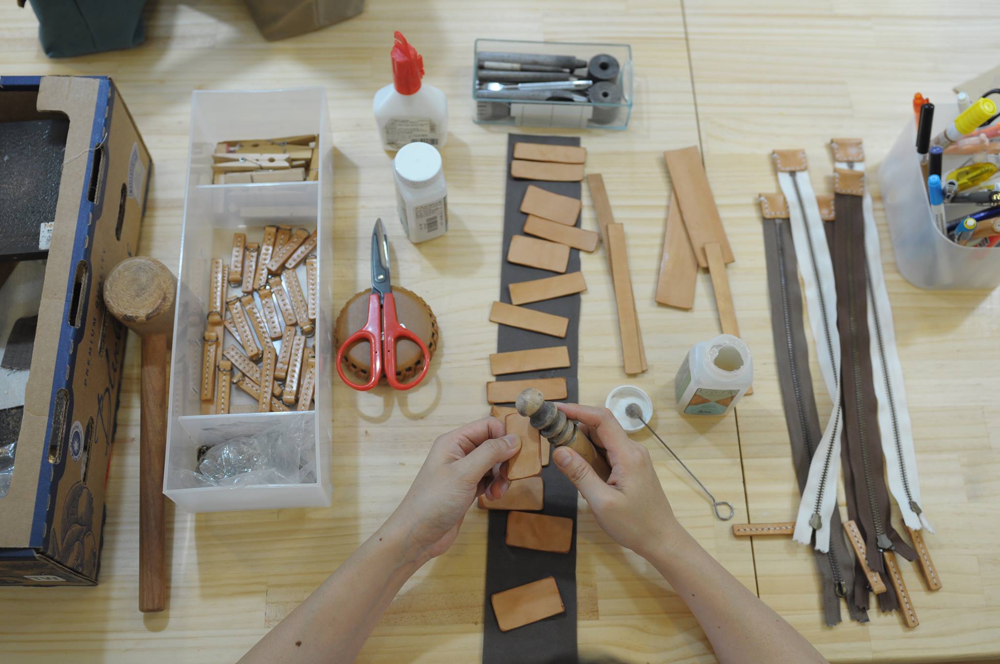 包括裁片、修圓、磨緣、上邊油、上光,接下來才是打洞和手縫,若非一次準備一些起來,單一個打好洞敲好名字的小小飾片,前後得花上15分鐘才能完成,真的很費時。
