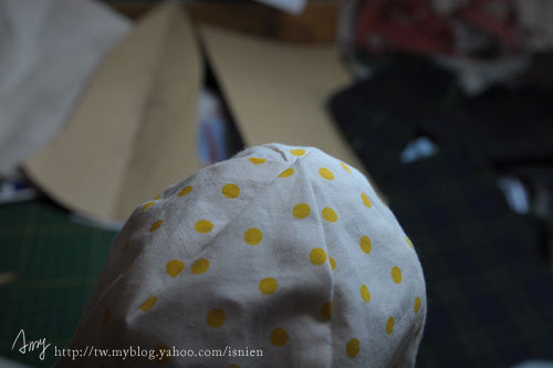 第一次失敗的版型,帽型變成頭頂尖尖的 (因為每片的角度太小)