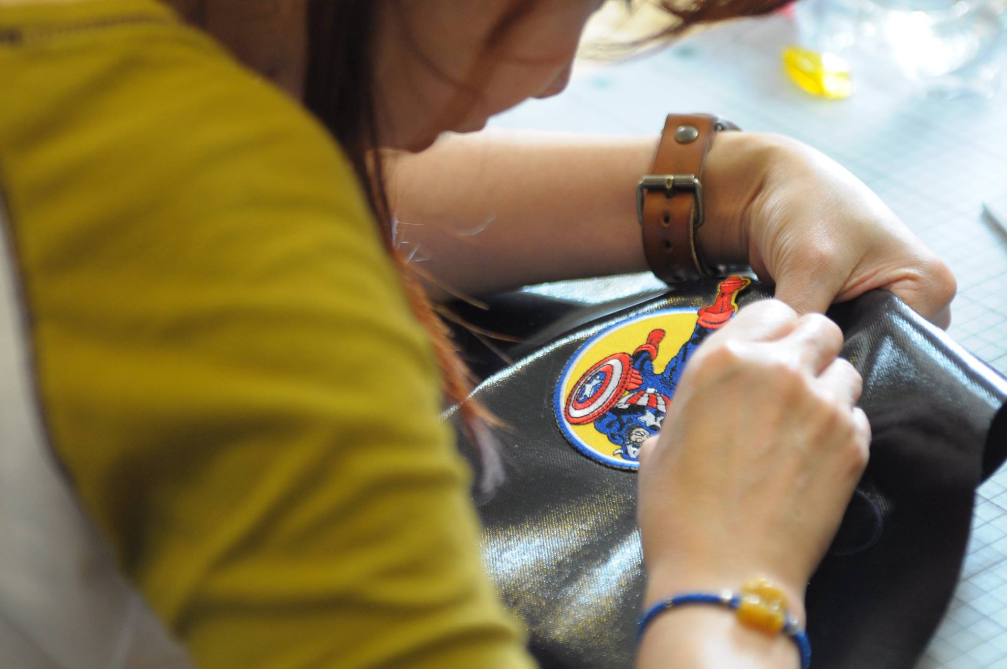 專注的媽媽最迷人,凱樺特地為寶貝兒子上網買了最愛的美國隊長和蜘蛛人圖案,正在專心縫製中。