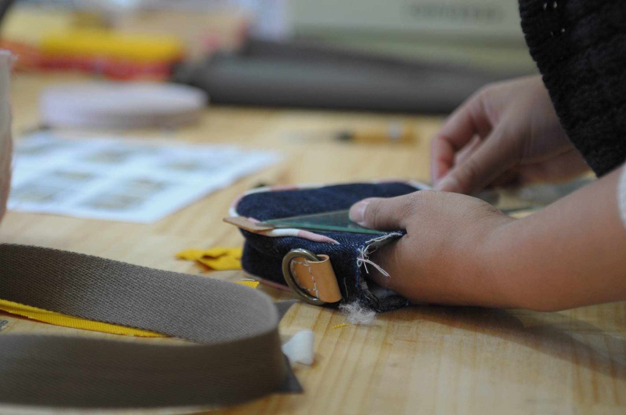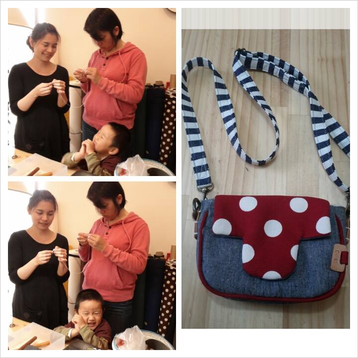 Sylvia媽媽的手部特寫,這是為小班女兒妞妞做的相機包,雖然媽媽嘴上念著說,不想做粉紅色,但還是做了女兒愛的粉紅色給她,花了不少時間和耐心,做錯了再拆,不夠滿意又拆。