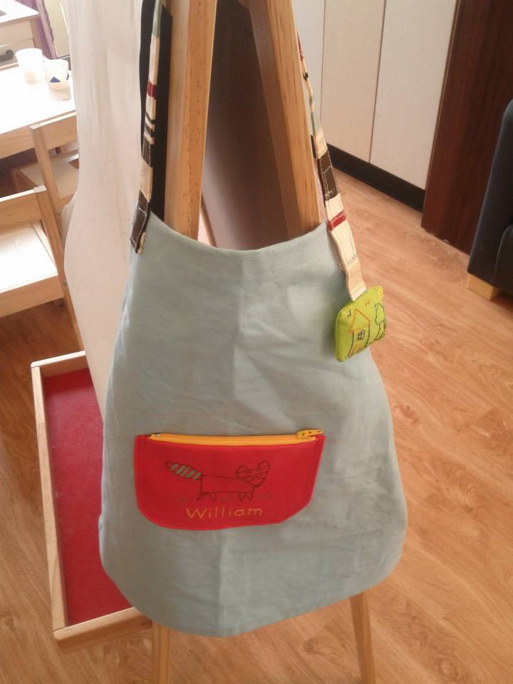 玉芬跟我住在同一個社區,有兩個兒子,第一次來工作室上課是就是先幫兩個兒子作畫畫圍裙,口袋的圖案是兒子挑選的圖片,綁繩上的圖案這是兒子自己畫的,繡在送給他的圍裙真的很有意義耶,上面的海鷗共有四隻,代表一家四口。