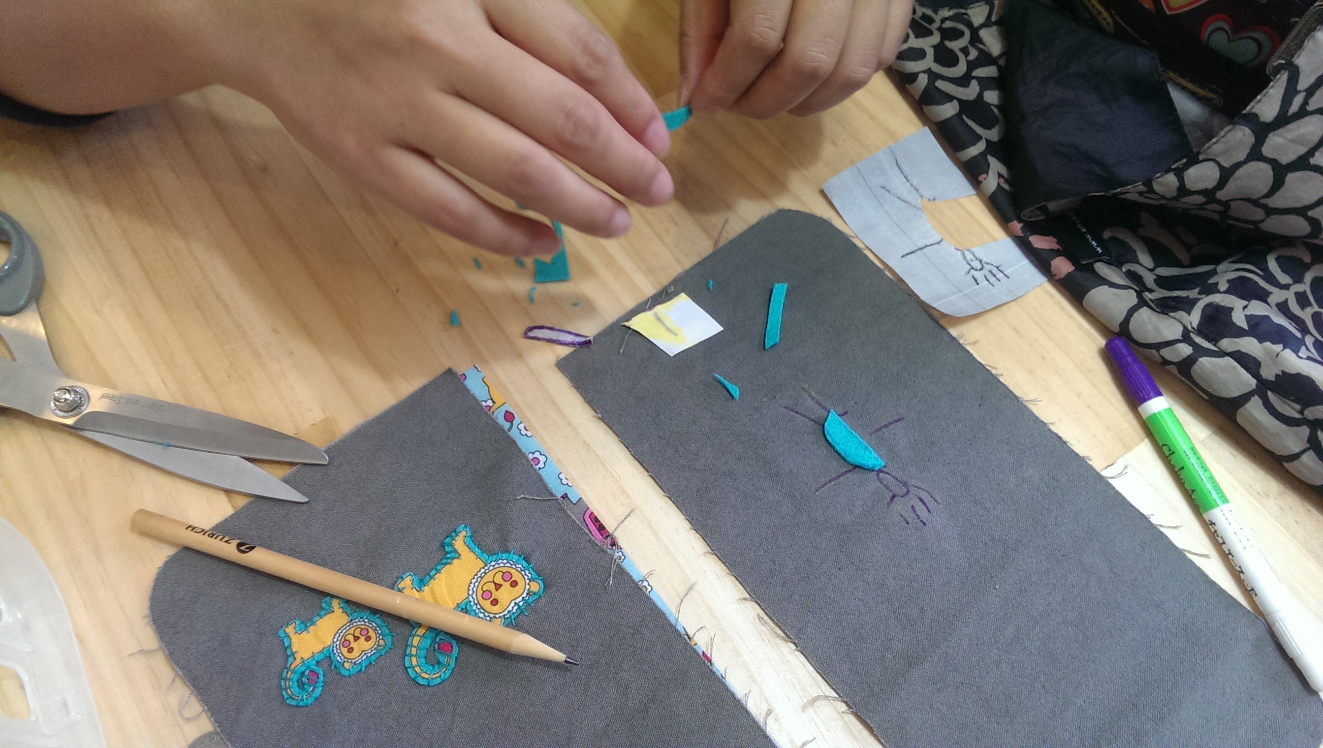 才剛完成相機包,緊接著再幫自己做一個要帶一家三口出門用的餐具包,拿女兒妞妞畫的小人圖案轉印在布上,配上不織布和手縫線,等於是跟女兒共同創作的包喔,超有趣的。