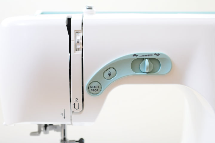 側面看過去的角度,右側有兩顆大旋鈕,上方的是壓腳上下位置的旋鈕,下方則是切換花樣的旋鈕,與電腦型的縫紉機最大的不同,它是用機械式的方式去切換的。