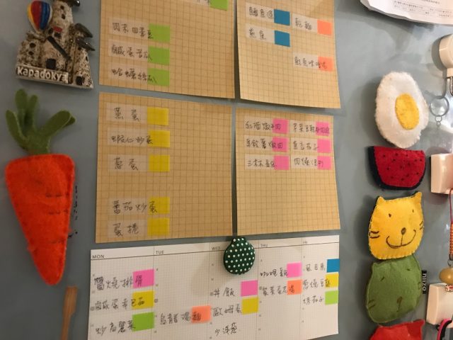 我把自己會煮的菜色用便利貼一一寫下來,並用顏色標記分類,每週採買前就先把下週要煮的菜色都規劃好,這時也能把冰箱裡有的蔬果魚肉一起考慮進去,避免到超市時,不知道冰箱到底還有甚麼?因為實在有太多次冰箱裡有馬鈴薯然後我又買了一袋馬鈴薯,冰箱裡沒有蔥,卻誤以為有而沒買,然後苦思要放棄這道菜色,還是要衝出門去買?